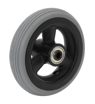 Vollgummi wird oft als Standardmaterial verwendet. Es ist leise, schont den Boden und eignet sich gut für unebene Untergründe. Allerdings nutzen sich Vollgummiräder schneller ab und können (in schwarzer Ausführung) Spuren hinterlassen.